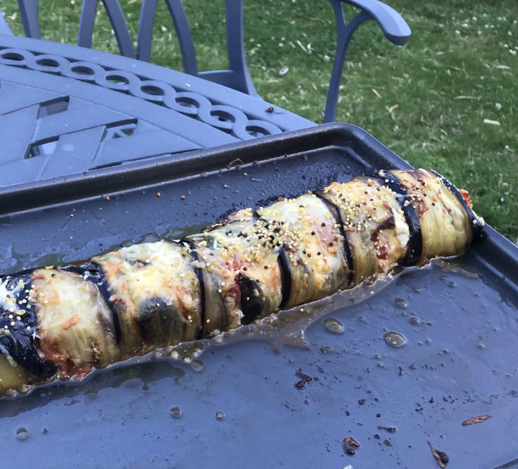 Avant d’enfourner tu peux saupoudrer de parmesan ton roulé d’aubergines.